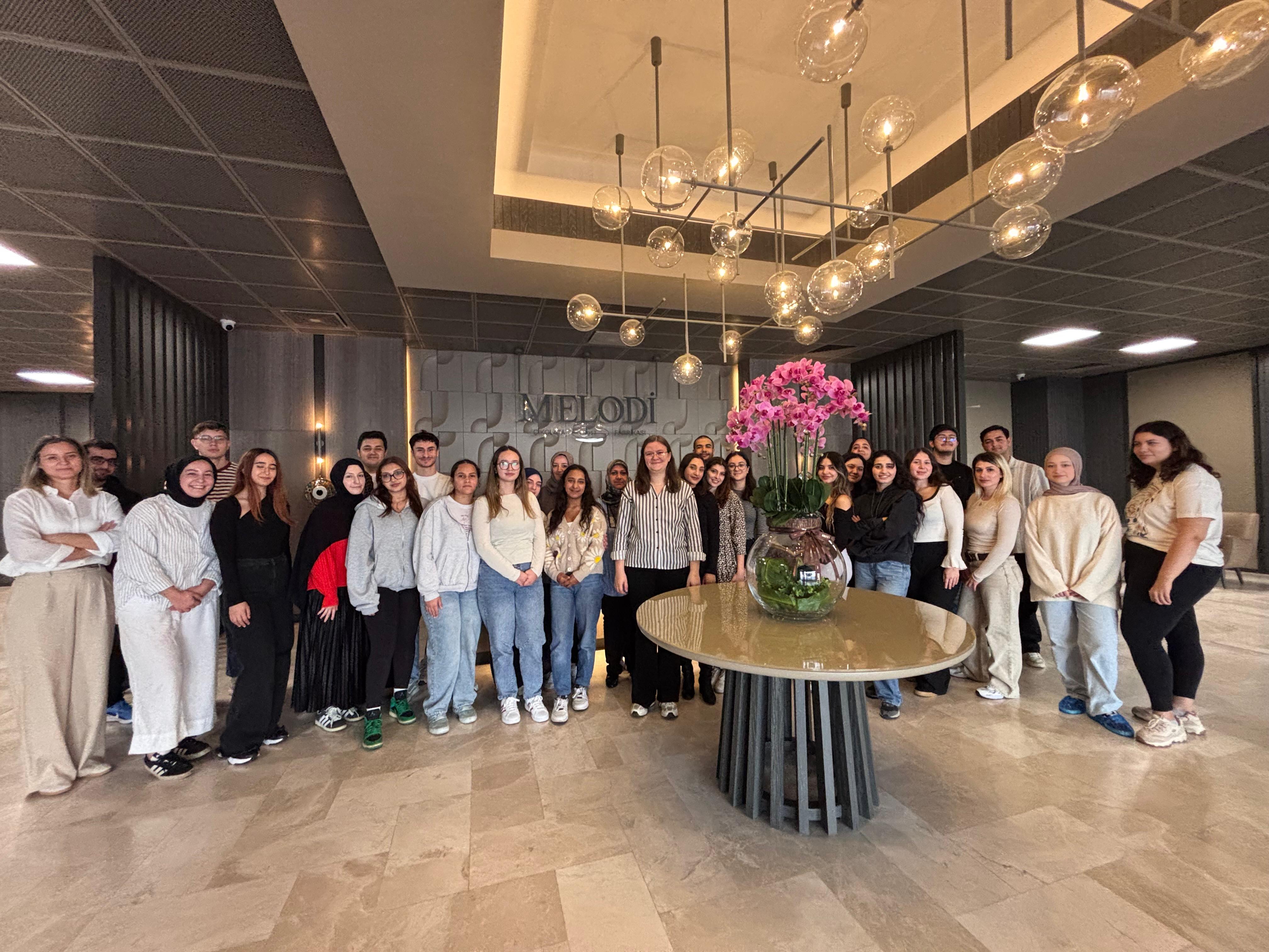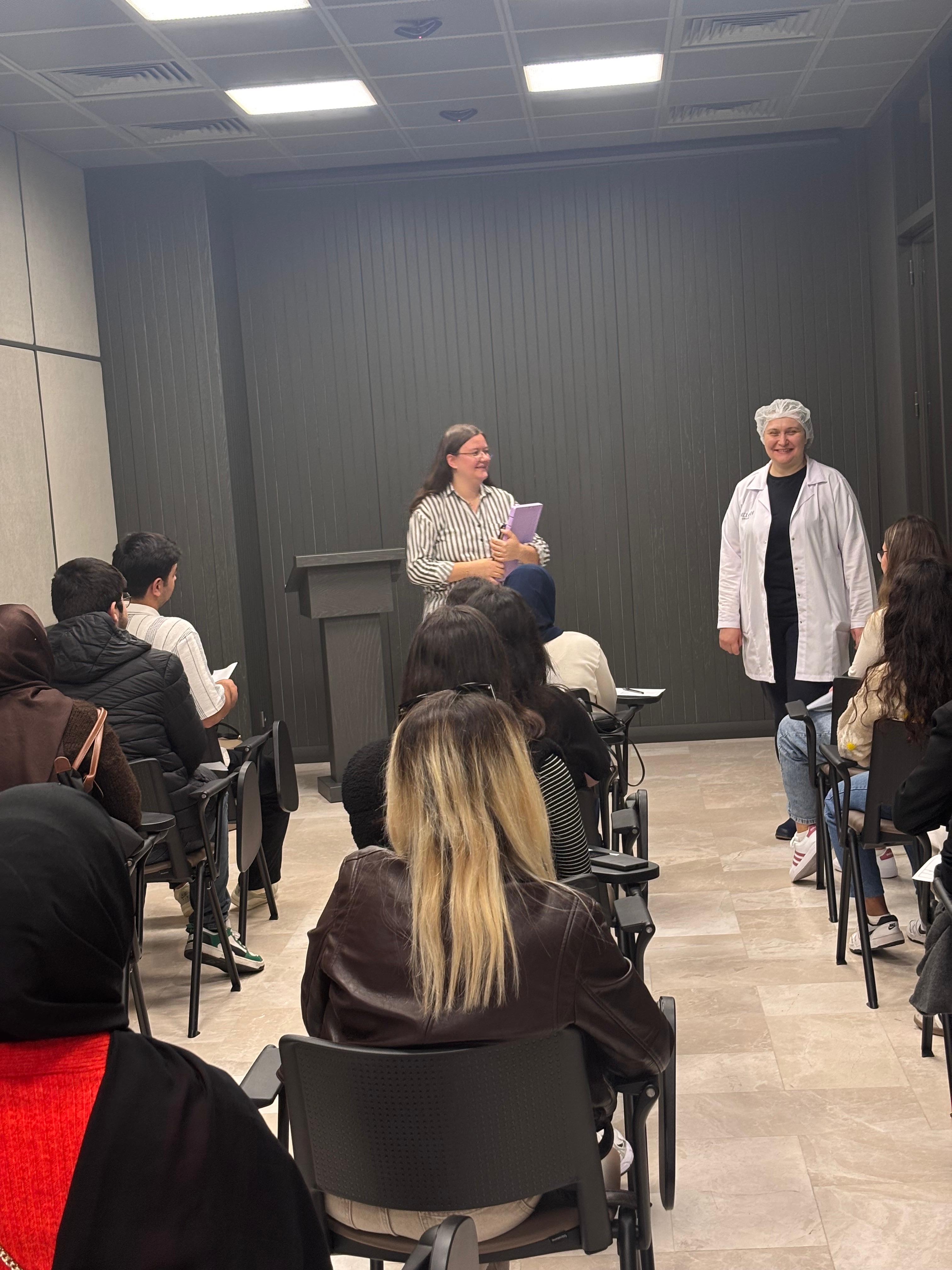 Ayrıca üretim hattında kullanılan endüstriyel ekipmanlar, otomasyon sistemleri, gıda güvenliği protokolleri, hijyen–sanitasyon standartları, ISO ve HACCP uygulamaları, kalite kontrol parametreleri, toplu üretim planlaması, ürün standardizasyonu ve sürdürülebilir üretim yaklaşımı hakkında ayrıntılı bilgilendirmeler yapıldı. Bu sayede öğrenciler, üretim sahasında yürütülen iş akışını inceleyerek profesyonel üretim organizasyonu, hat verimliliği, iş güvenliği prosedürleri, ürün izlenebilirliği ve parti yönetimi gibi endüstriyel mutfak ve çikolata fabrikasyon süreçlerine ilişkin uygulamaları yerinde görme fırsatı buldu.