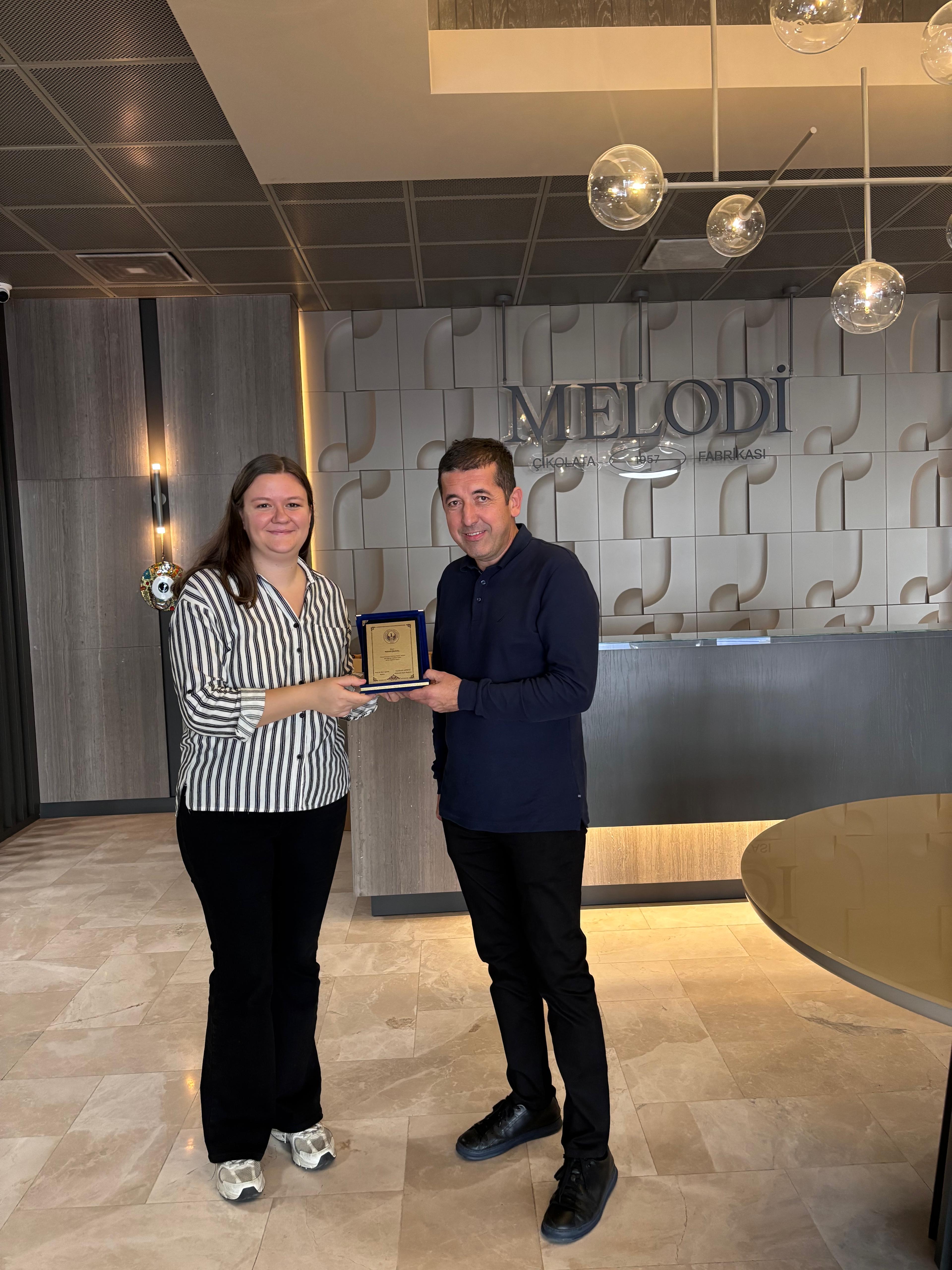 Gerçekleştirilen inceleme ve bilgilendirme turunun ardından, programa sağladıkları değerli katkılar ve kurum adına gösterdikleri misafirperverlik için Pastacılık ve Ekmekçilik Programı adına Melodi Çikolata Üretim İdari İşler Müdürü Sayın Fatih Şan ve Değerli Eşi Burçin Şan’a teşekkür mahiyetinde bir plaket takdimi yapıldı. Bölüm başkanımız Öğr. Gör. Zeynep Kurhan sektörle kurulan bu tür iş birliklerinin öğrencilere hem uygulamalı deneyim kazandırdığını hem de gastronomi alanında güncel teknoloji ve üretim pratiklerini tanıma fırsatı sunduğunu ifade ederek Melodi Çikolata ailesine teşekkürlerini iletti.