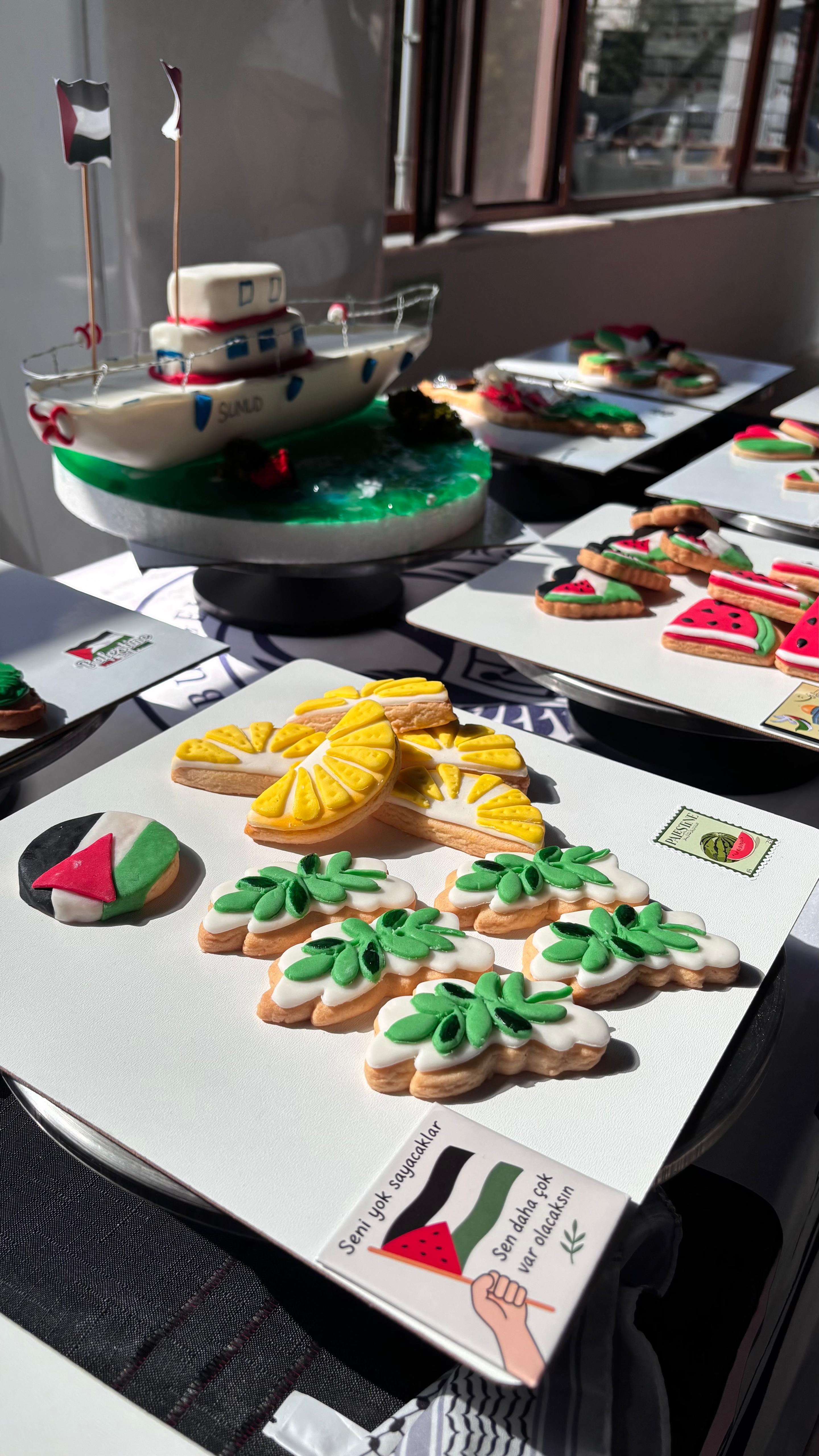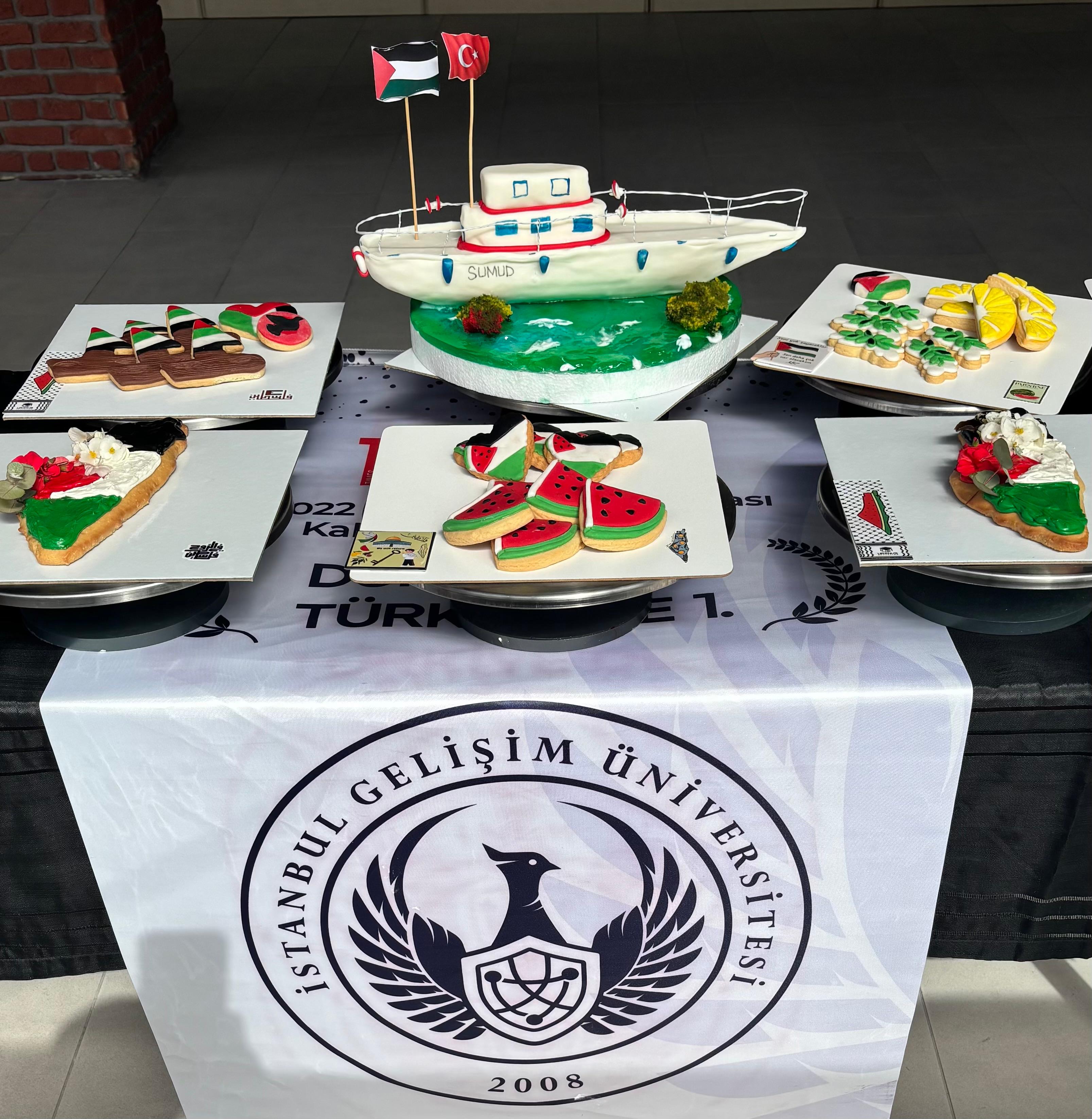 Etkinlik kapsamında üretim sürecine tematik bir yaklaşım kazandırılmış ve hazırlanan pastane ürünleri, küresel ölçekte süregelen insan hakları ihlalleri ve savaş mağduriyetlerine karşı duyarlılığı yansıtacak şekilde kurgulanmıştır. Öğrenciler, şeker hamuru kullanarak çeşitli kurabiyeler ile “Sumud Filosunu” temsil eden bir model gemi tasarlamışlardır. Bu çalışma, direnişin ve kararlılığın simgesi olan gemiyi gastronomi teknikleriyle buluşturarak hem yaratıcı sunum hem de uygulamalı üretim becerilerini ön plana çıkarmıştır. Gemiyi çevreleyen mavi su pastası ile özgür deniz temsili oluşturulmuş; öğrenciler jel kaplama, renk geçişi ve yüzey dekorasyonu tekniklerini kullanarak görsel ve kavramsal bütünlüğü sağlamıştır. Bu sayede anlamlı bir sembolik anlatım, lezzet kompozisyonu ve estetik sunum ile bütünleştirilmiştir.