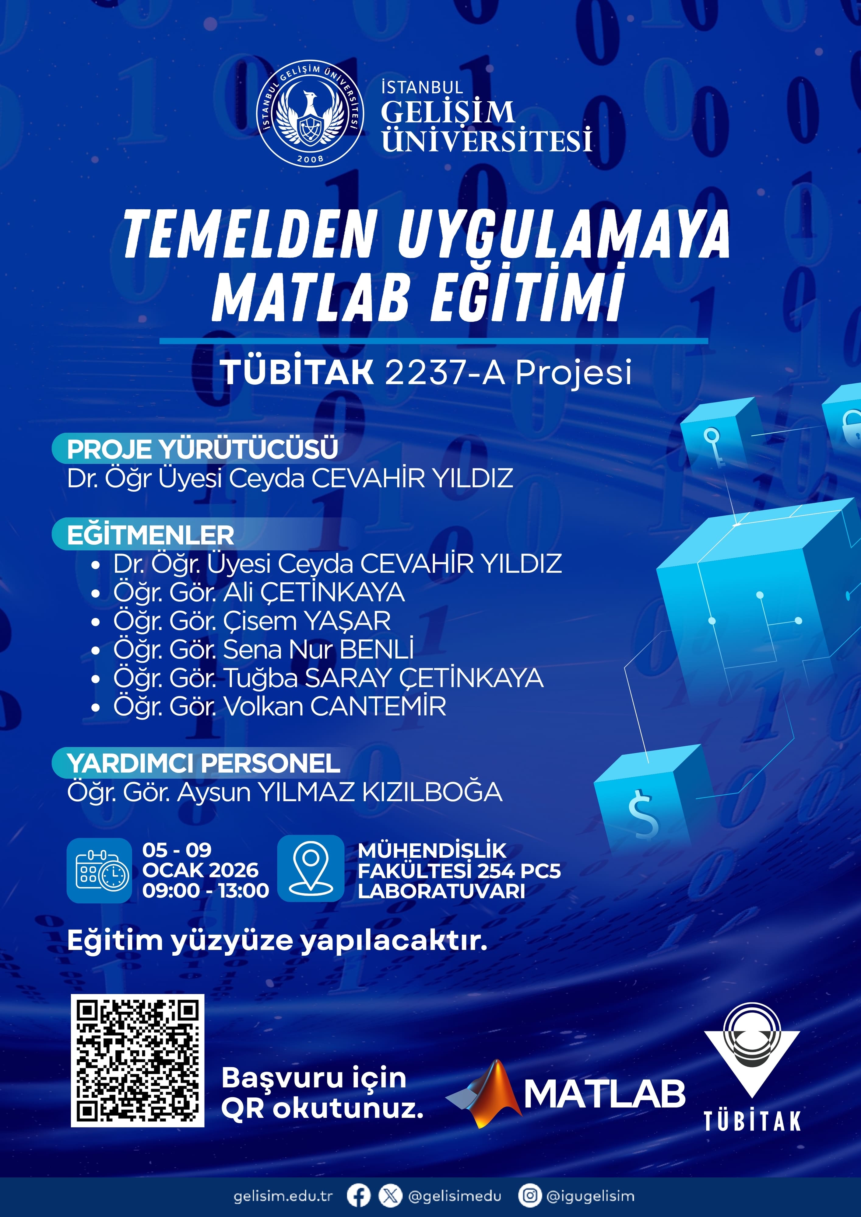 05–09 Ocak 2026 tarihleri arasında her gün 09.00–13.00 saatleri arasında yapılacak olan program, Mühendislik Fakültesi 254 PC5 Laboratuvarı’nda yüz yüze düzenlenecek. Eğitim kapsamında, MATLAB ortamında temel programlama yapıları, veri analizi, görselleştirme ve uygulamaya yönelik örnek çalışmalar ele alınacak.
