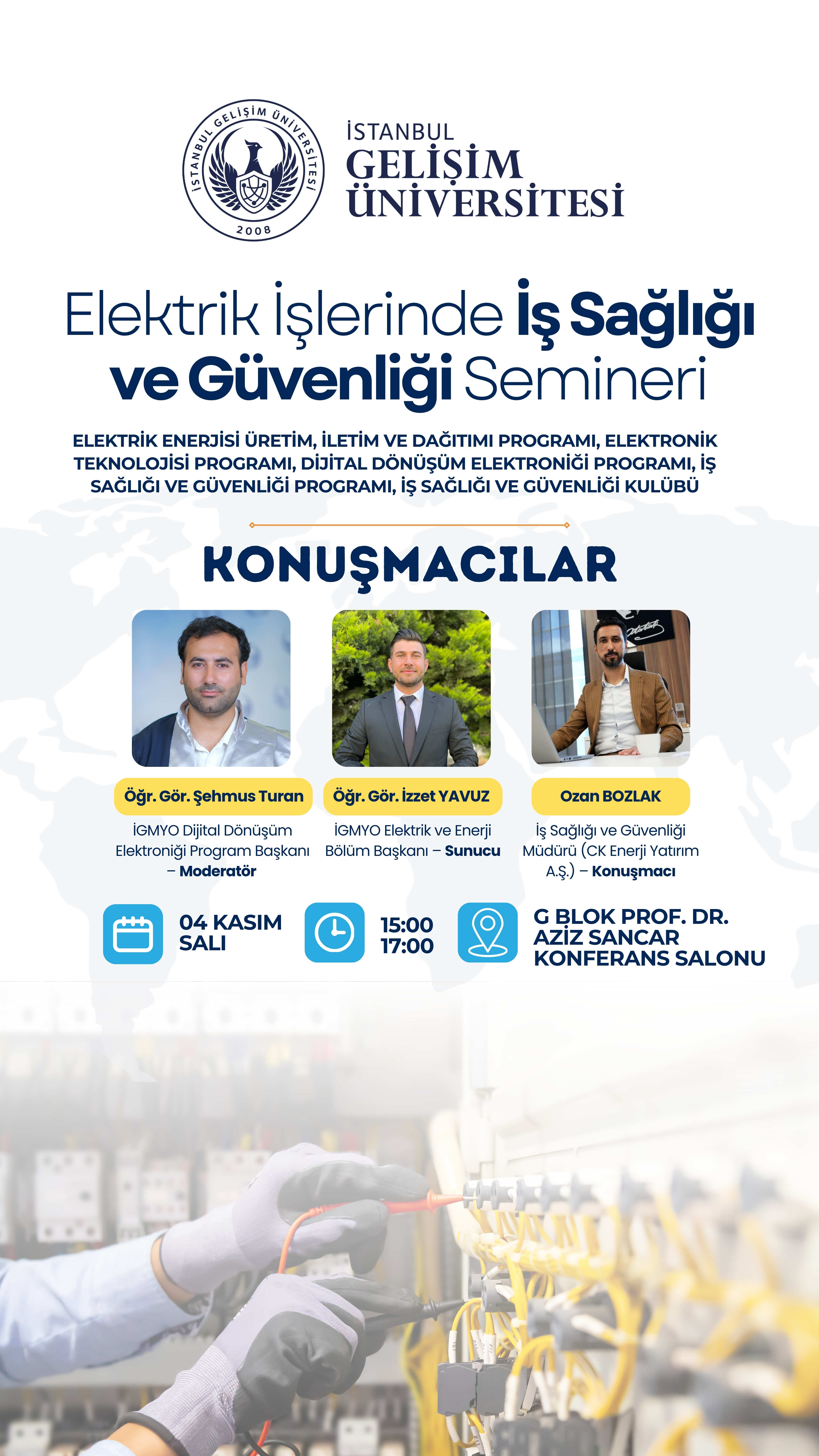 İstanbul Gelişim Meslek Yüksekokulu Elektrik Enerjisi Üretim, İletim ve Dağıtımı Programı, Elektronik Teknolojisi Programı, Dijital Dönüşüm Elektroniği Programı, İş Sağlığı ve Güvenliği Programı ve İş Sağlığı ve Güvenliği Kulübü iş birliğiyle düzenlenen “Elektrik İşlerinde İş Sağlığı ve Güvenliği” semineri, sektör ve akademiyi bir araya getiriyor.