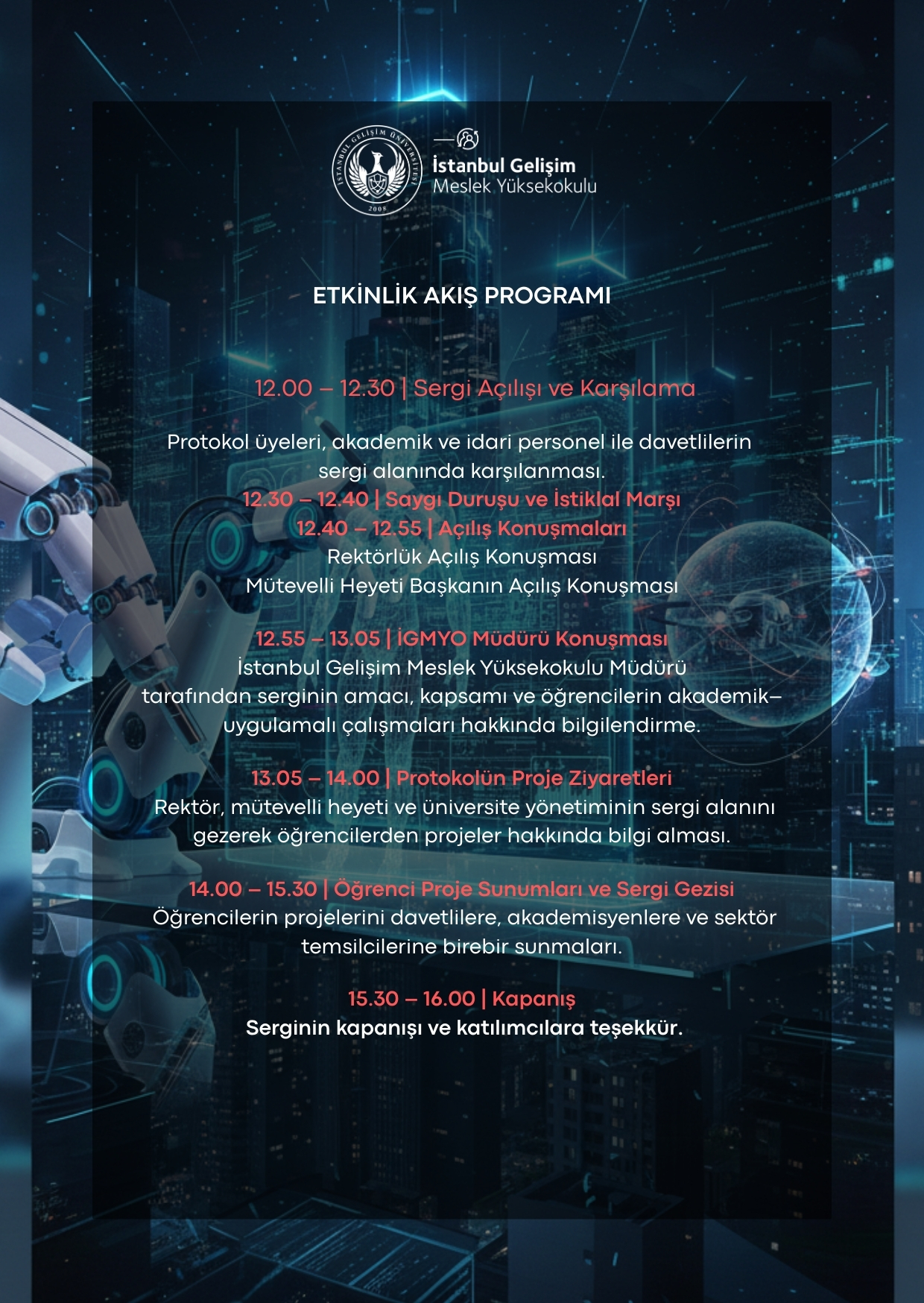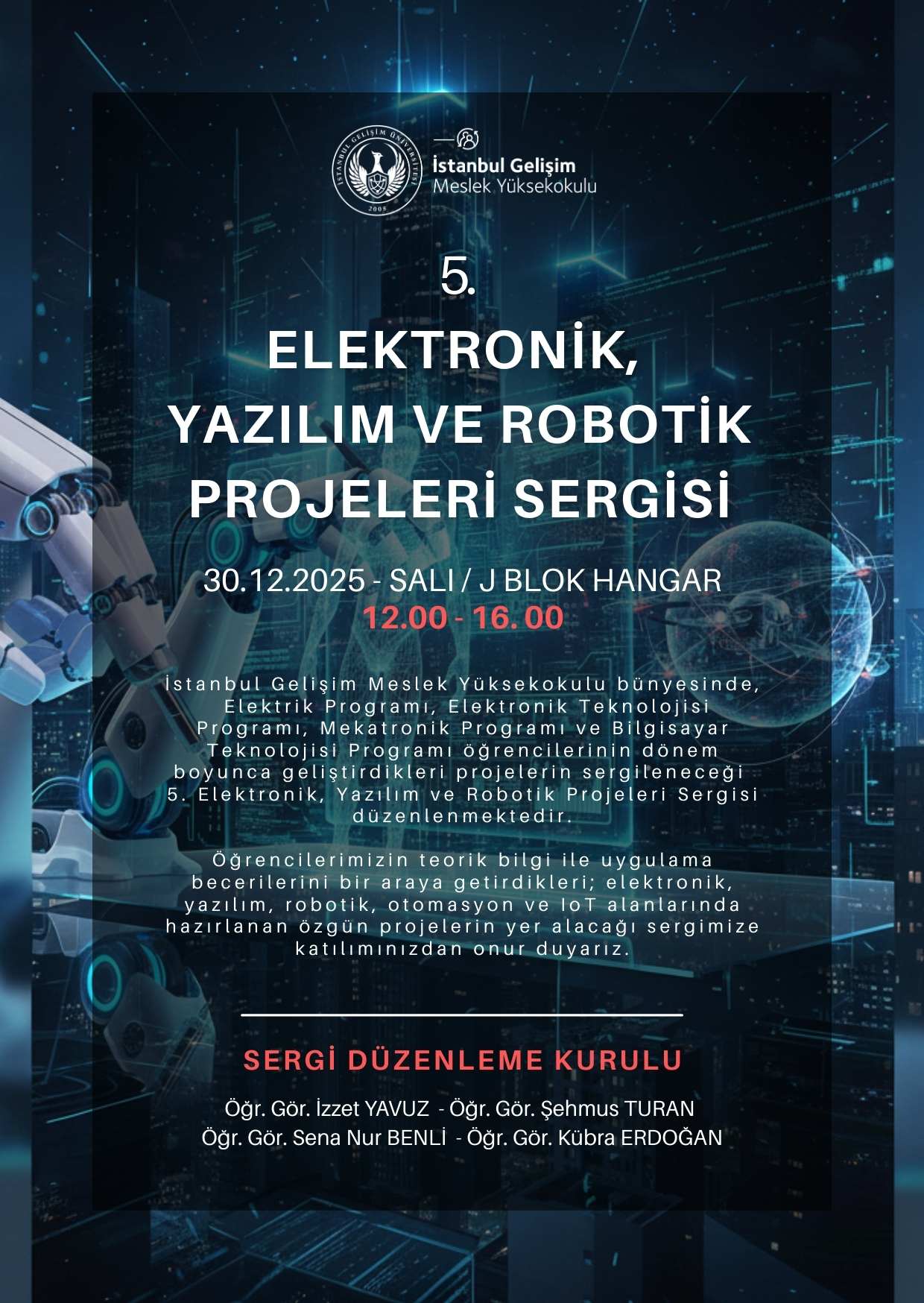 Elektrik Programı, Elektronik Teknolojisi Programı, Mekatronik Programı ve Bilgisayar Teknolojisi Programı öğrencilerinin dönem boyunca hazırladıkları projelerin yer alacağı sergide; elektronik, yazılım, robotik, otomasyon ve IoT alanlarında geliştirilen özgün çalışmalar ziyaretçilerle buluşturulacaktır.